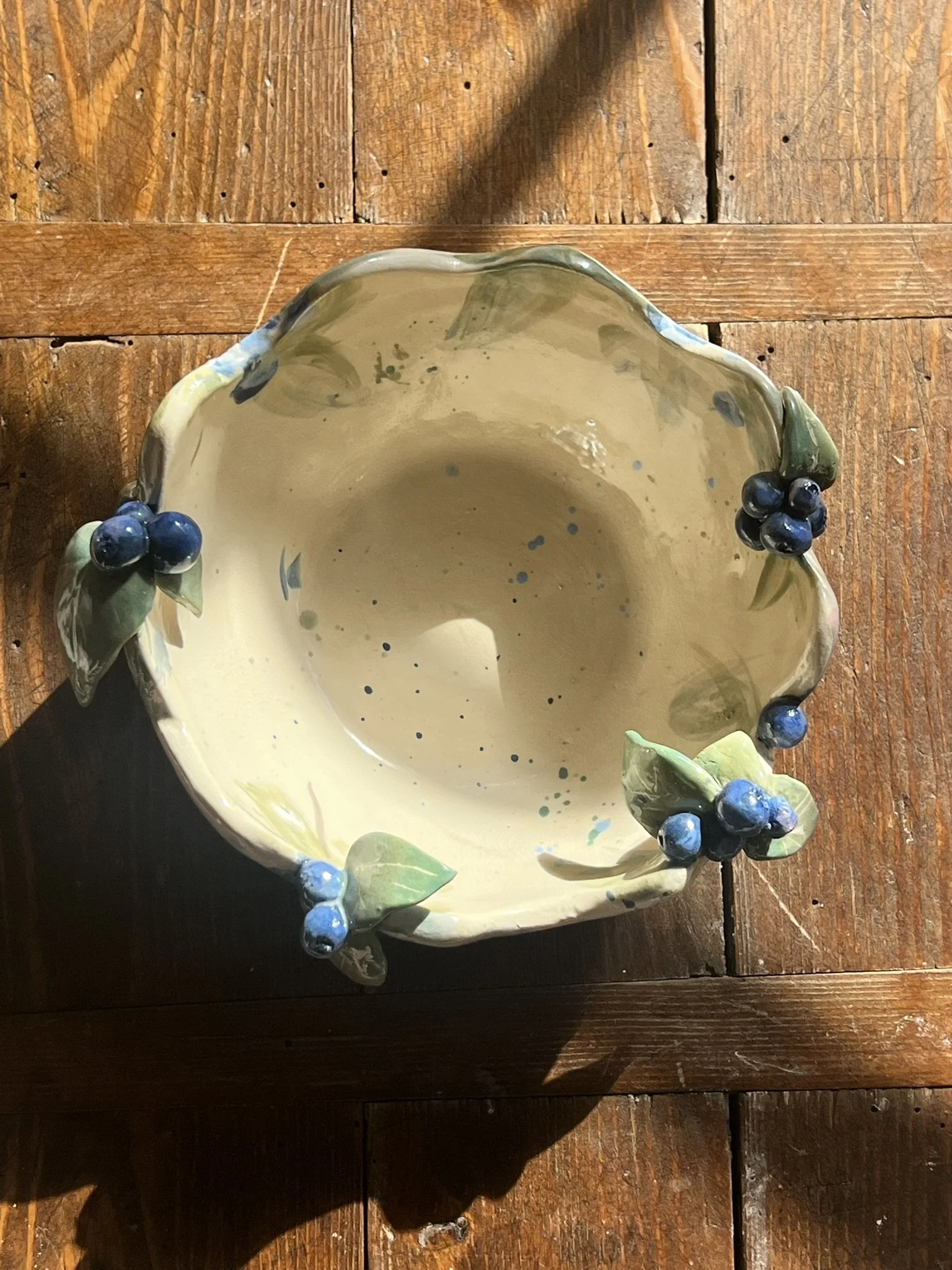 Hand built stoneware bowl with decorative blueberries; food and dishwasher safe